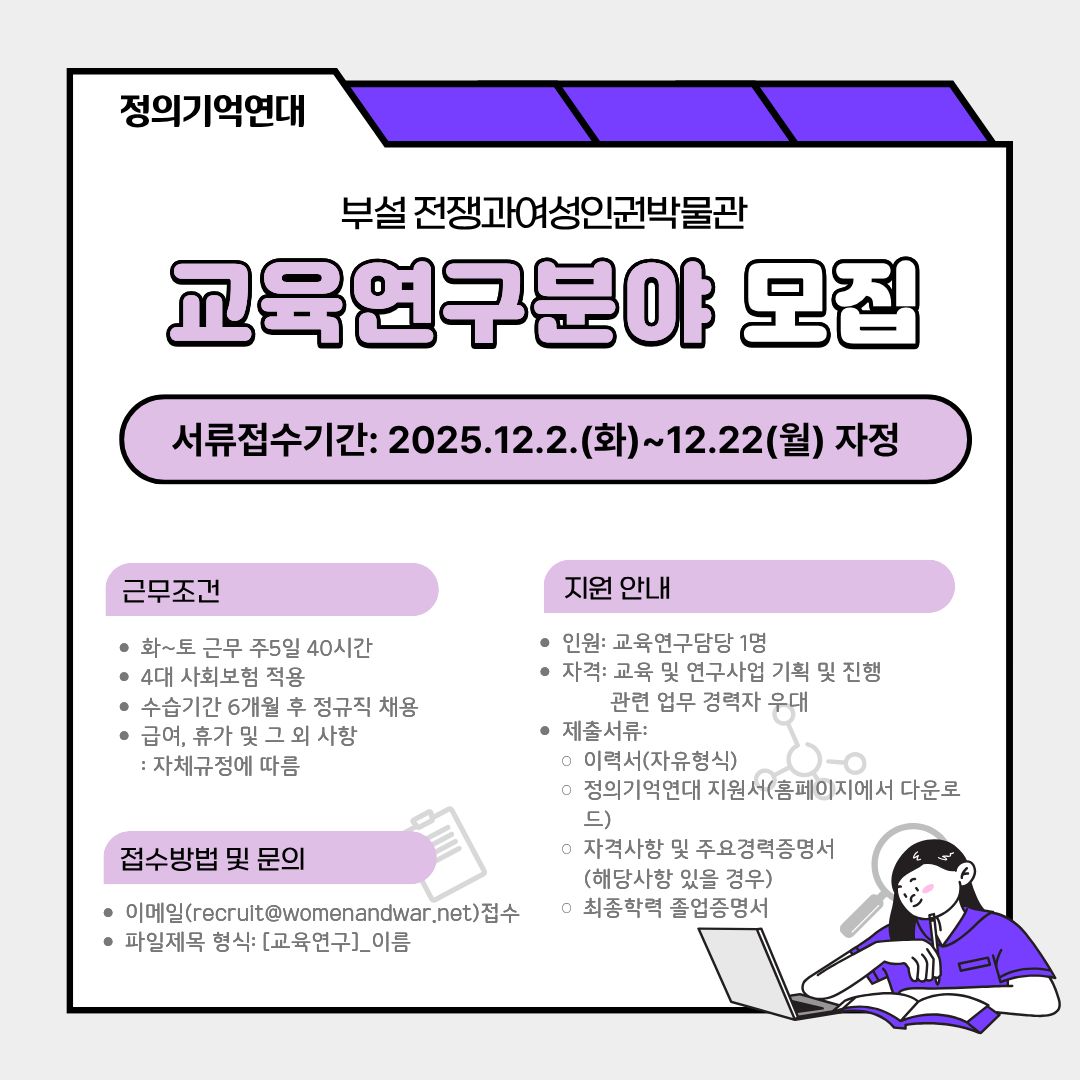 (재)일본군성노예제 문제해결을 위한 정의기억연대(이하 정의기억연대)에서는 여성인권평화센터의 전쟁과여성인권박물관에서 교육 연구를 담당하실 분을 찾습니다. 일본군성노예제 문제의 기억과 계승, 평화를 함께 만들어 나갈 분들을 기다립니다.
