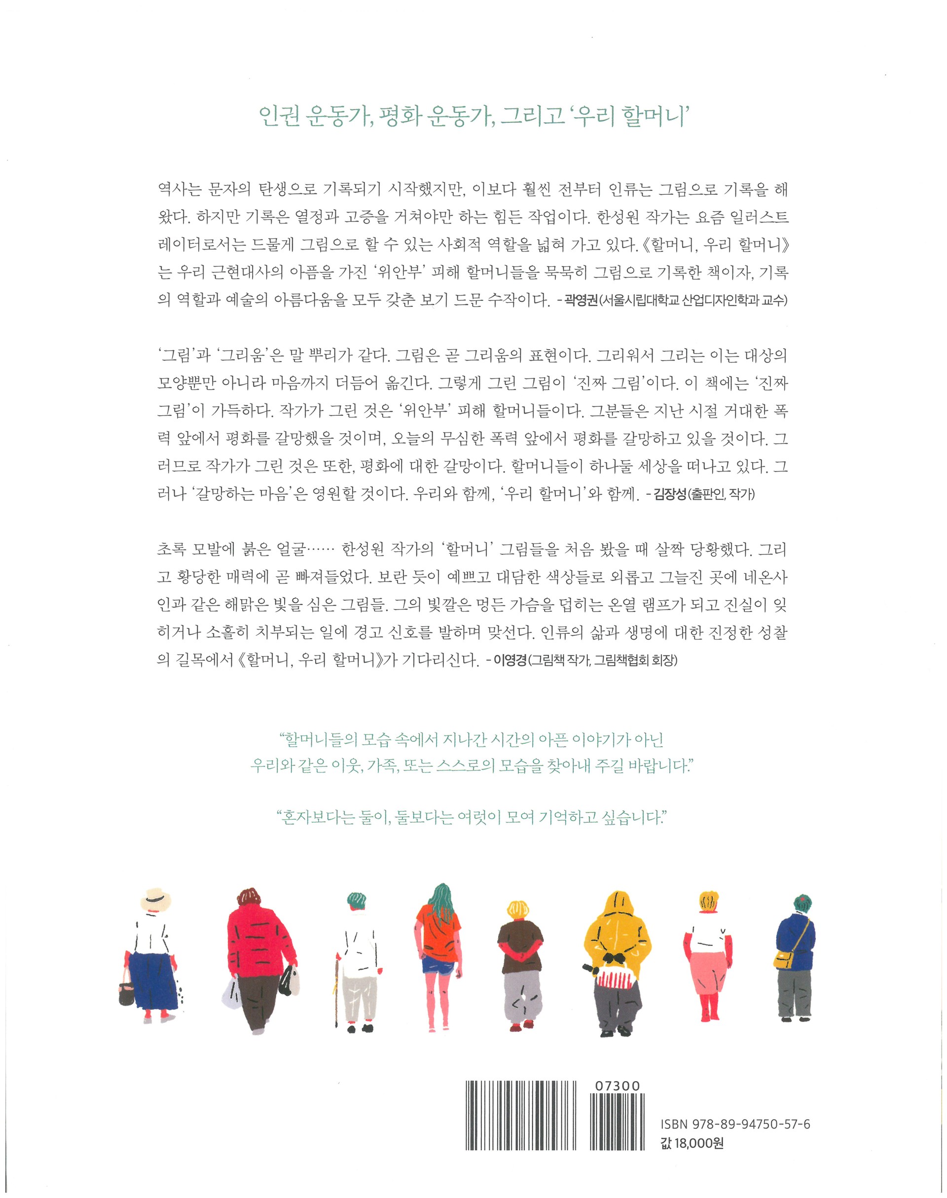 이 책은 우리 가까이에서 즐겁게 생활하시는 평범한 할머니의 모습, 작가의 일상생활에서 영감을 얻어 표현해본 상상 속의 할머니, 현재까지도 국내외 현장에서 뜨거운 열정으로 활동을 이어가시는 ‘위안부’ 피해 할머니들의 용기 있는 행보를 담았다. 그분들의 아픔을 직관적으로 드러내기보다 청소년 독자들을 포함해 이 책을 읽는 모두가 할머니들의 모습에 친근하게 다가가기를 바라며, 아름다운 일러스트와 쉬운 만화로 할머니들의 이야기를 풀어냈다. 잊지 않고 기억하기 위해 함께한 시민들의 다양한 활동도 담았다. 우리 곁 어느 곳에나 존재해왔고 존재하실 그분들. 역사 속 힘든 시간을 겪으신 할머니들의 아픔에 공감하고 그 역사를 잊지 않고 함께 기억하는 일에, 이 책은 새롭고도 밝은 길잡이가 되어줄 것이다.