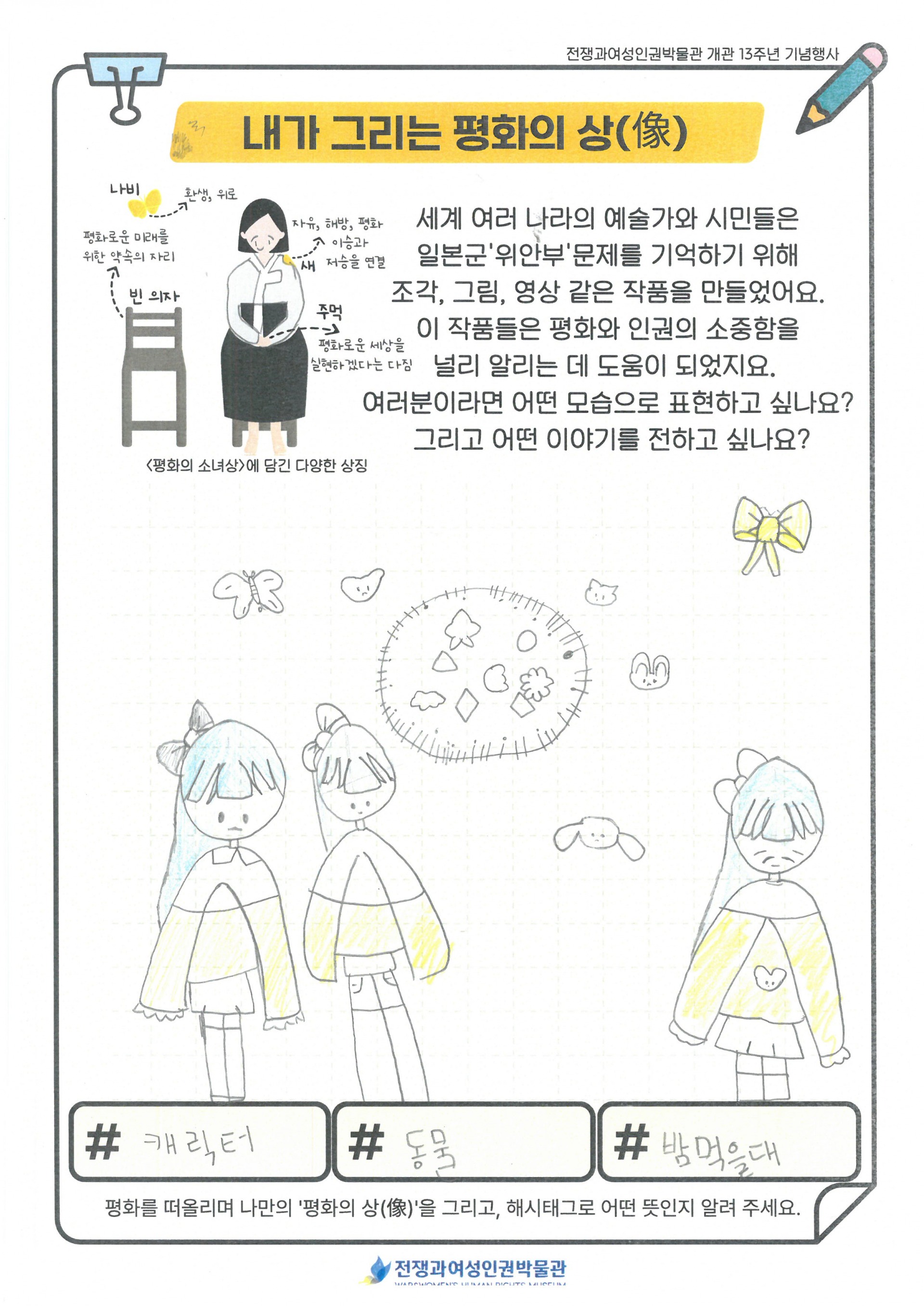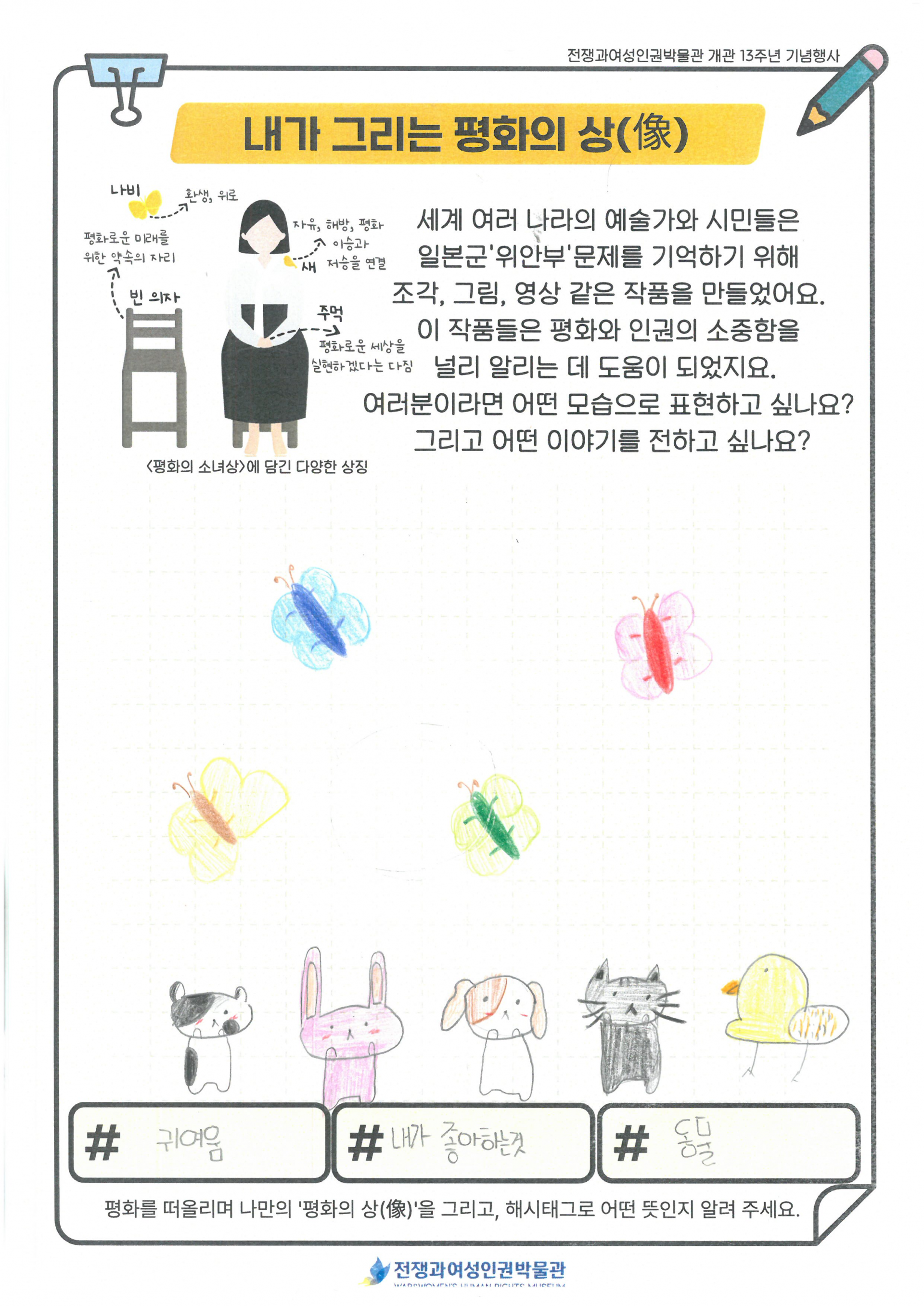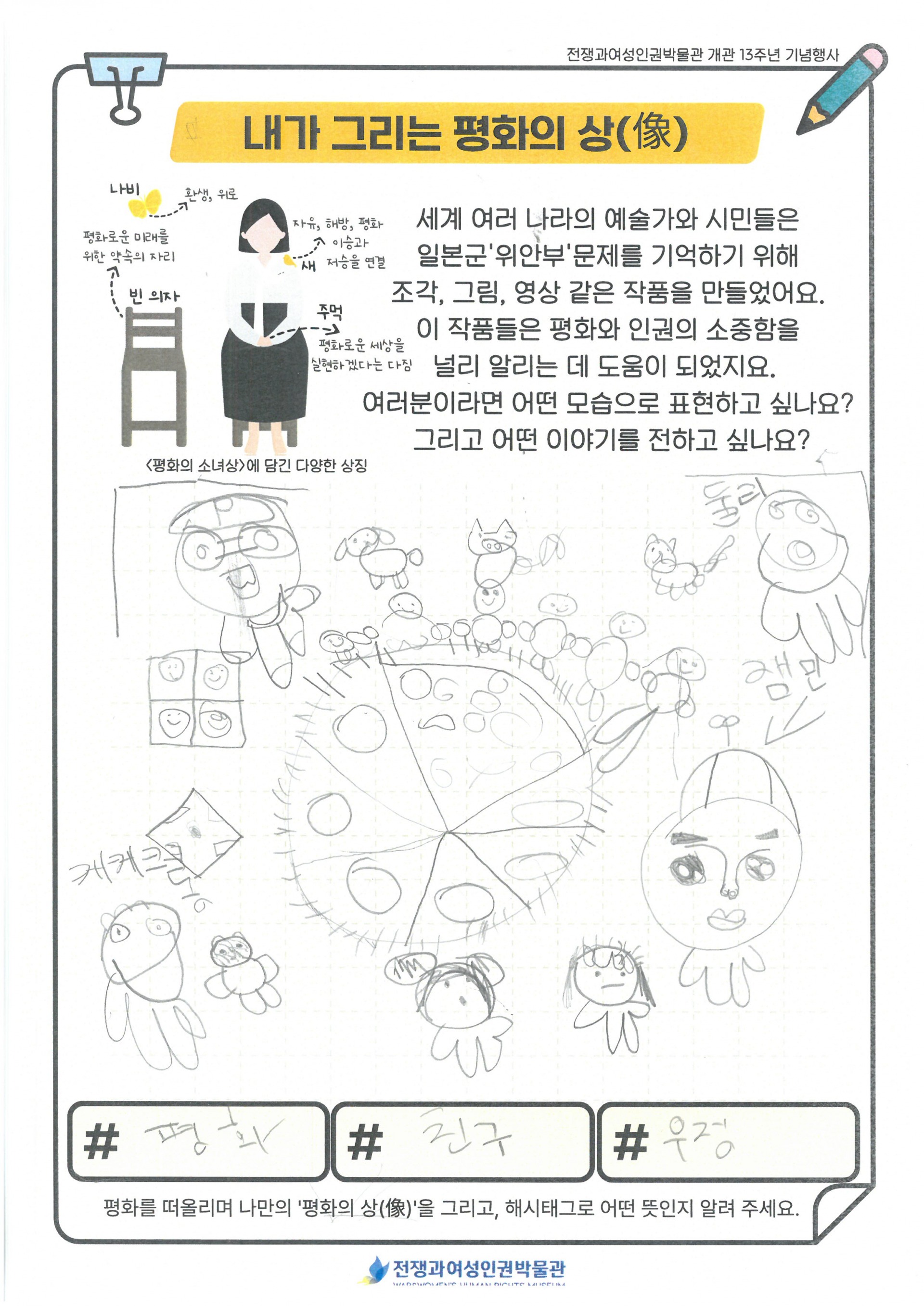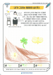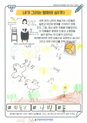 동화 '꽃할머니' 시청과 일본군'위안부' 피해 생존자들의 이야기를 듣고, 박물관 투어를 진행 하였습니다. 미리 정보를 알고 난 후 관람하게 되니 학생들이 더 이해가 쉽게 관람할 수 있었습니다. 관람을 마친 후 다시 모여 내가 생각하는 평화의 상(像)을 활동지에 그려보고, 오늘 체험을 일기로 그려보았습니다. 처음 자신이 생각하는 평화를 상징하는 것을 그려보라 했더니 잘 이해를 못하더라구요. 그래서 주변에서 가장 평화롭고 행복한 순간 평화로운 도구가 무엇인지 찾아서 그려보라고 하였더니 열심히 그려 완성하였습니다.