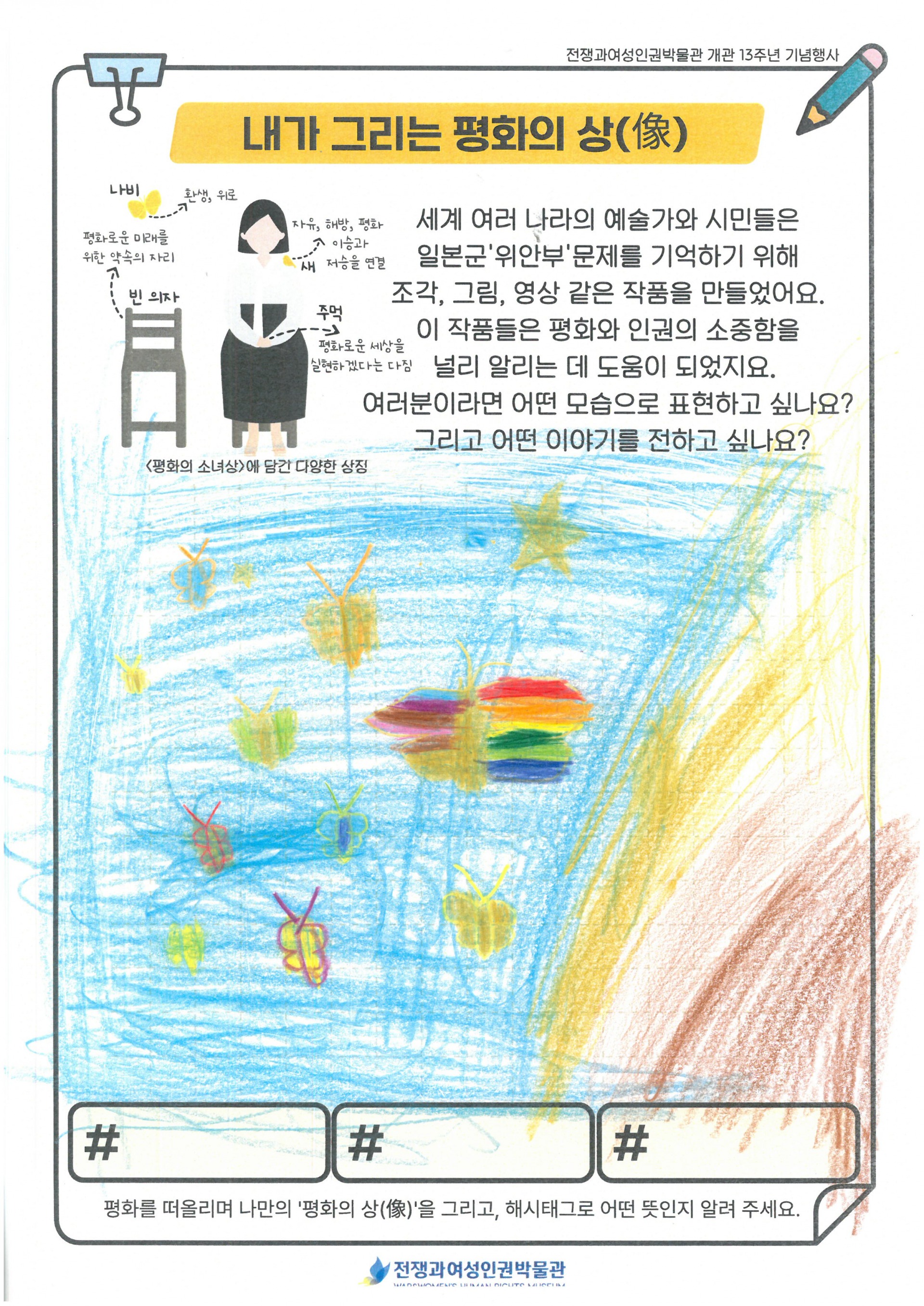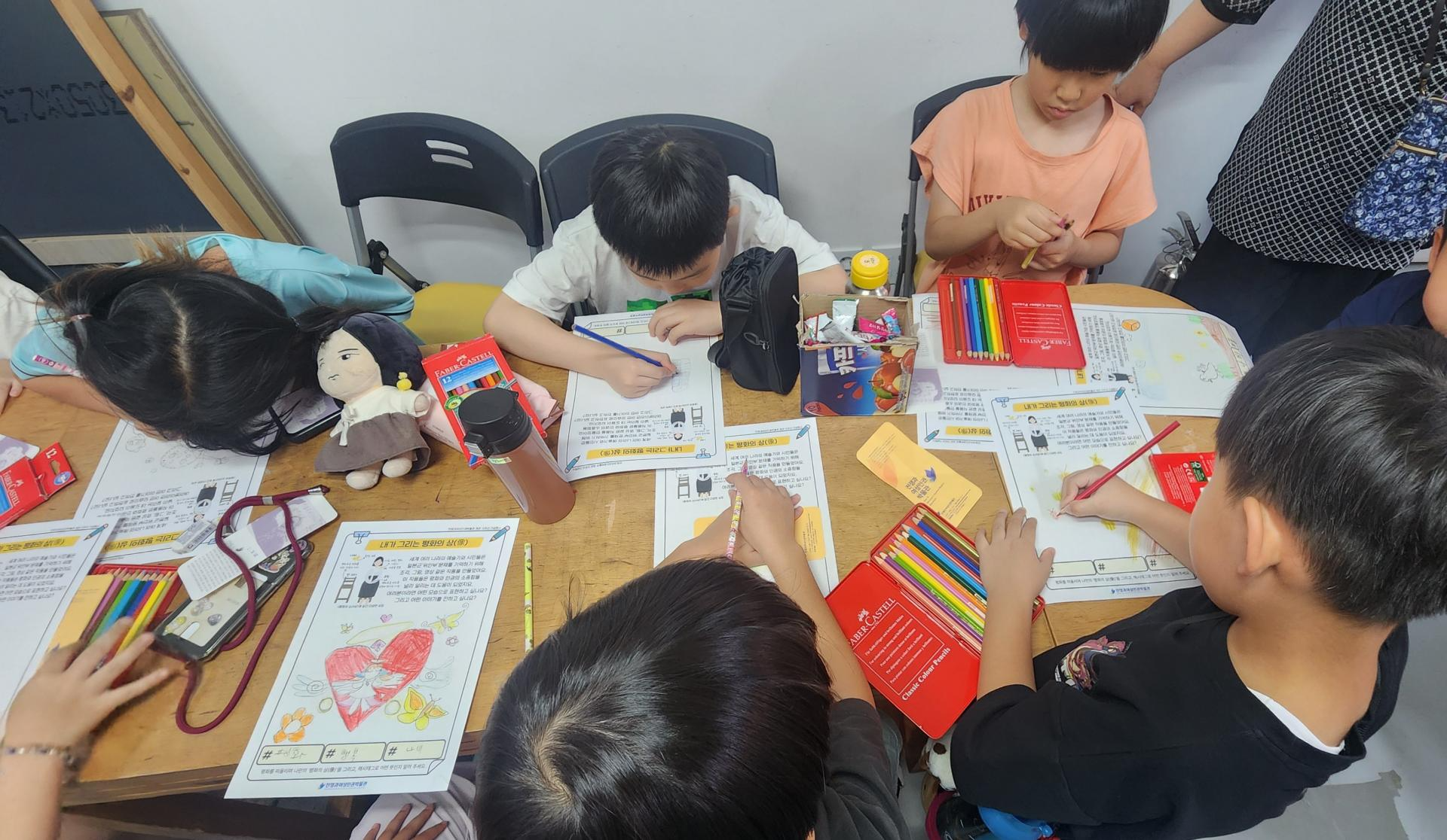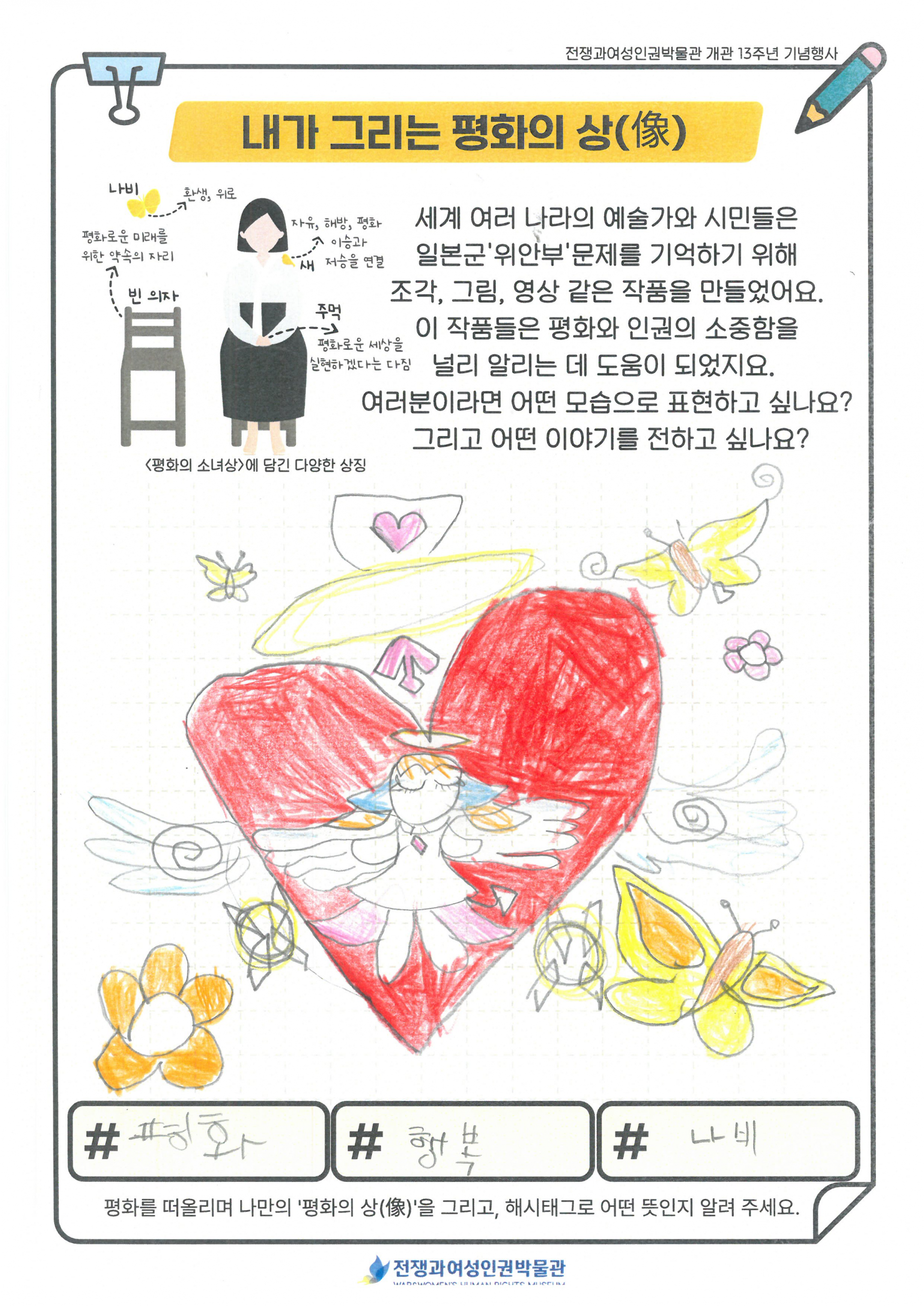 동화 '꽃할머니' 시청과 일본군'위안부' 피해 생존자들의 이야기를 듣고, 박물관 투어를 진행 하였습니다. 미리 정보를 알고 난 후 관람하게 되니 학생들이 더 이해가 쉽게 관람할 수 있었습니다. 관람을 마친 후 다시 모여 내가 생각하는 평화의 상(像)을 활동지에 그려보고, 오늘 체험을 일기로 그려보았습니다. 처음 자신이 생각하는 평화를 상징하는 것을 그려보라 했더니 잘 이해를 못하더라구요. 그래서 주변에서 가장 평화롭고 행복한 순간 평화로운 도구가 무엇인지 찾아서 그려보라고 하였더니 열심히 그려 완성하였습니다.