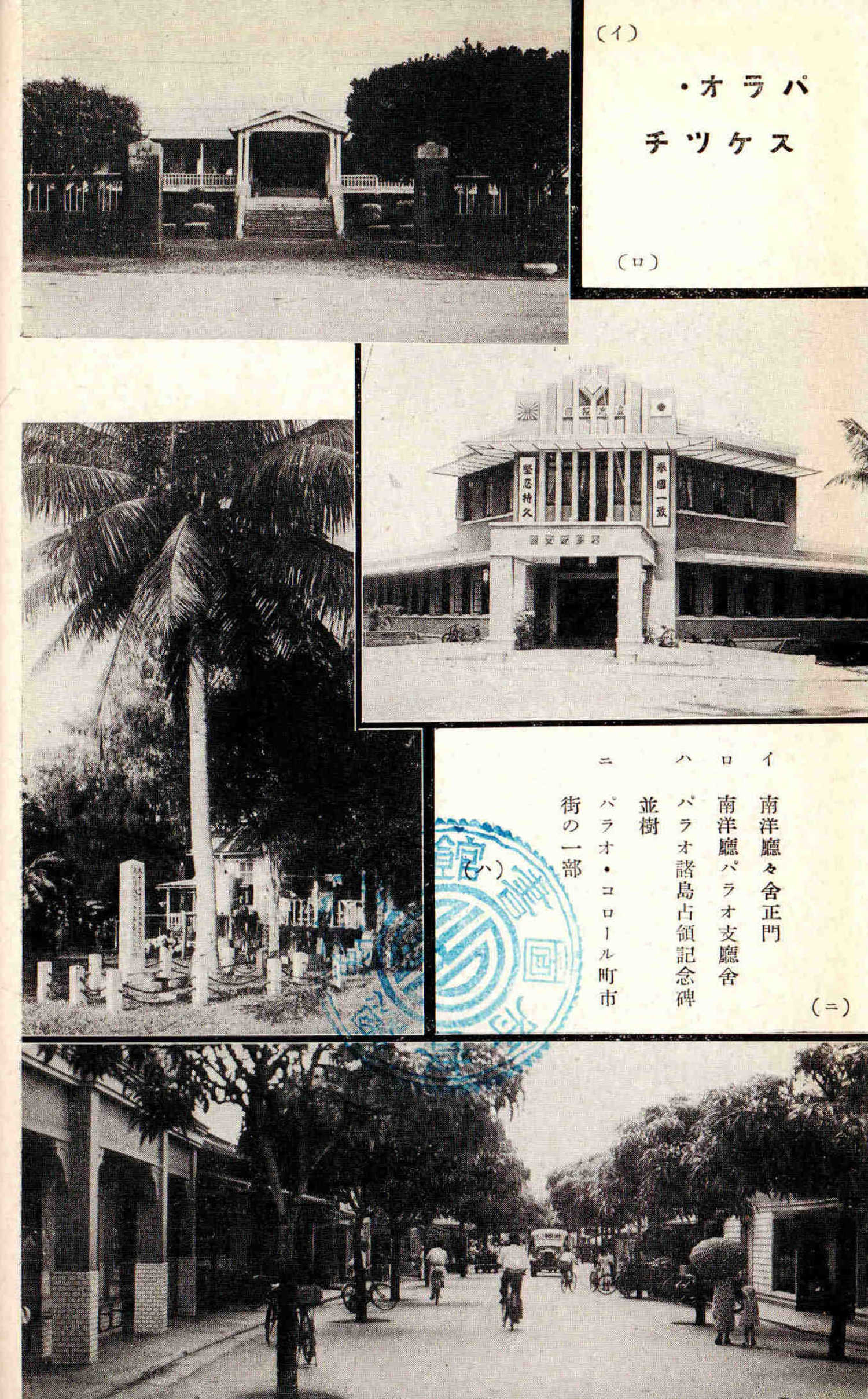 1940년 파라오 풍경 위에서부터 남양청 청사 정문, 남양청 파라오 청사, 파라오 제도 점령 기념비와 기념수, 파라오 코롤 거리